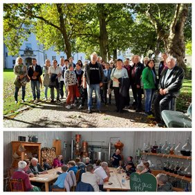 Nach dem Mittagessen ging es zur Brennerei mit Hofladen. Die Teilnehmer interessierten sich für die zahlreichen Apfelsorten, anschließend wurden die Obstsorten in flüssiger hochprozentiger Form getestet und Anton Herz berichtete aus seinem Leben und wie er zu seiner Leidenschaft, der Brennerei, gekommen ist. Viele Fläschchen fanden ihren Weg nach Harburg. Gegen 17.00 fuhr uns Dennis wieder sicher in unseren Heimatort zurück.