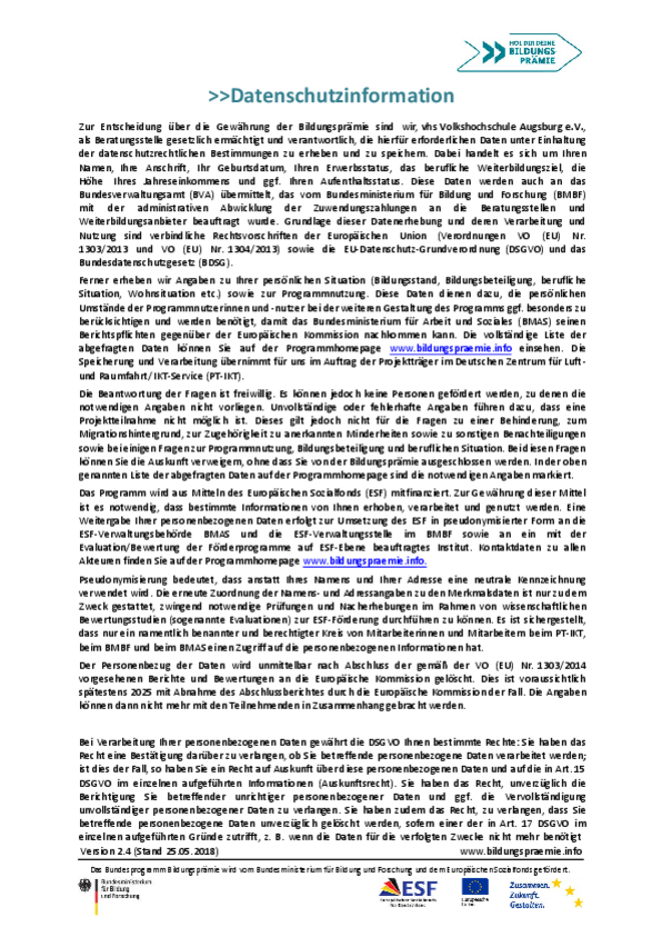 Laden Sie sich die für eine Beratung notwendigen Unterlagen einwilligung_praemiengutschein_dsgvo_vhs.pdf als pdf-Dokument herunter oder senden Sie uns ein Mail verwaltung@vhs-augsburg.de bzw. rufen Sie uns an (Tel.: 0821/50265-0), damit wir Ihnen die Einwilligungserklärung per Post zusenden können.